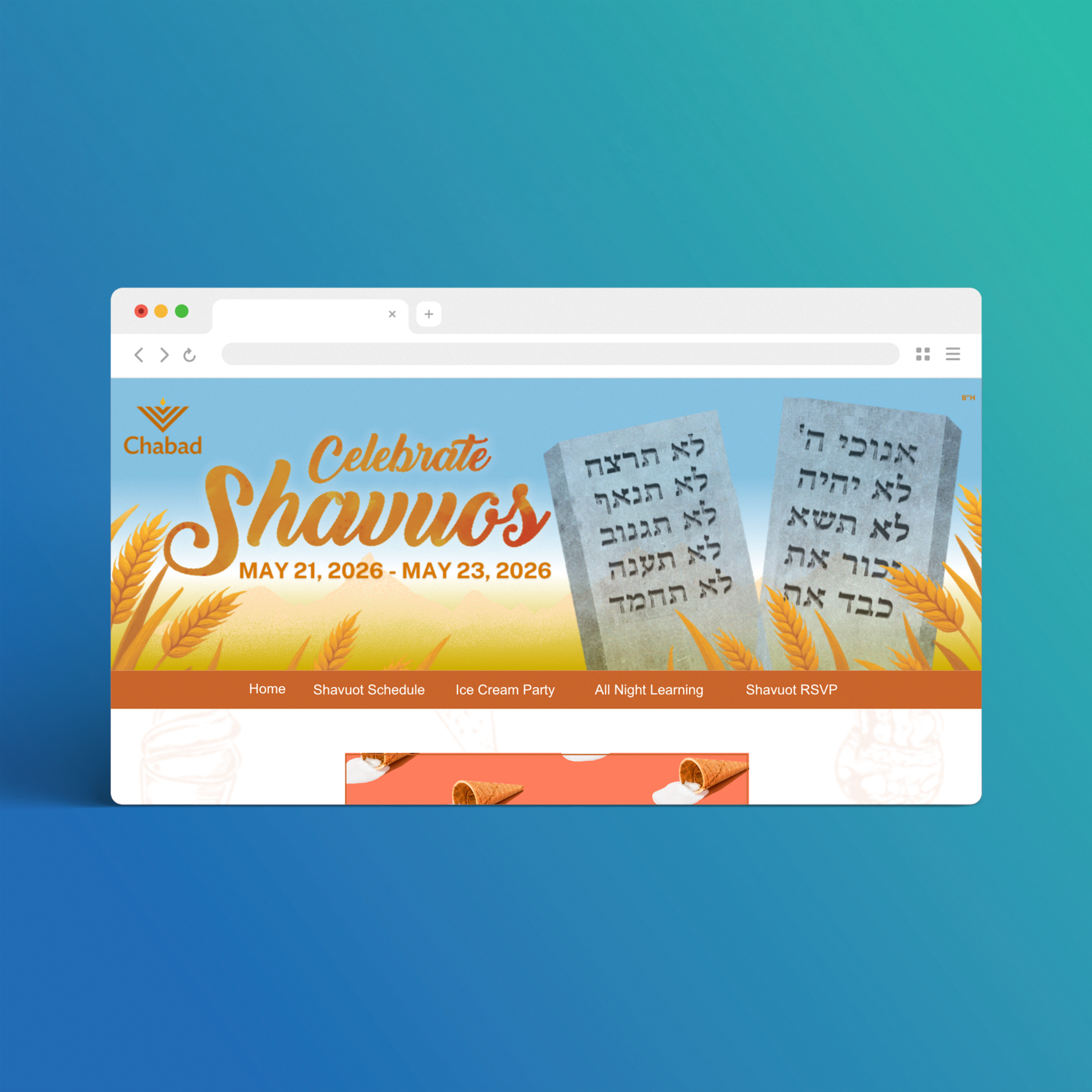 Honor the agricultural roots of the holiday with this warm, golden-hour Shavuos minisite design featuring lush wheat fields surrounding the sacred stone tablets of the Ten Commandments. Celebrating the Festival of Reaping (Chag HaKatzir), this visually rich template is perfect for communities wanting to emphasize both the Torah’s giving and the traditional harvest themes.